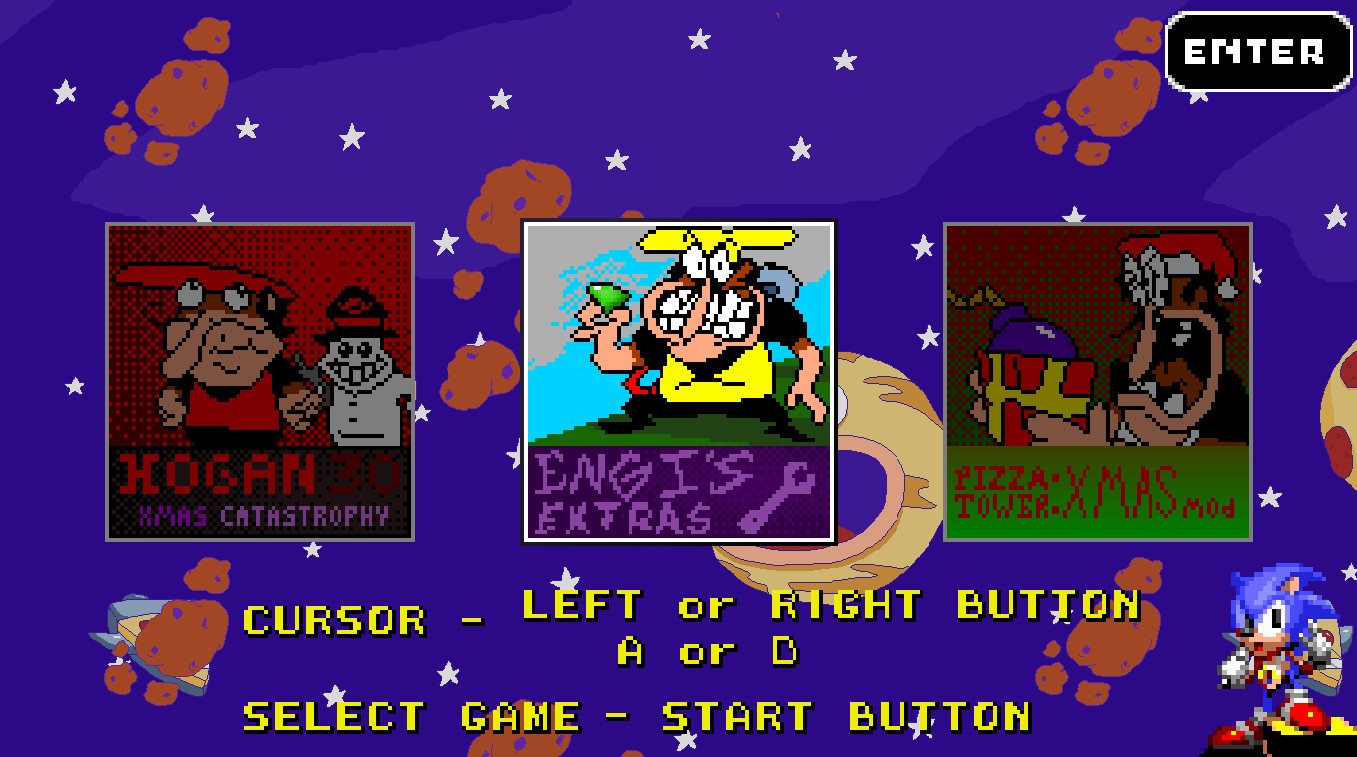 All references aside, this is a compilation of 3 Pizza Tower Mods, Hogan 30, Engis Extras and Xmas: The Final Delivery. This package is a reference to Sonic Classics/Collection on the Sega Genesis.